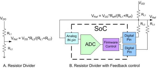 Every system has a supply voltage that can be used directly as the reference voltage or indirectly to obtain another voltage reference. A resistive divider method is the basic form of obtaining a voltage reference from the supply voltage as shown in Figure 1A. This basic circuit has no control loop and has the disadvantage that the reference voltage is directly proportional to the supply voltage variations.