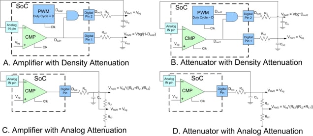 The self-modulated circuit can be used to obtain voltages higher (Amplifier) than the internal reference voltage by adding analog attenuator as shown in Figure 4C. The reference voltage value is shown in equation below