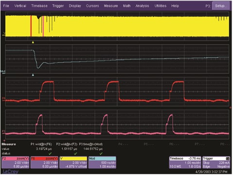 Though the insights discussed above are useful, the deeper picture of the power supply's response to a change in load is contained in the second (blue) trace in Figure 1. This trace is a track of all the values of the gate-drive pulse widths. Digital oscilloscopes are very good at showing a series of numbers versus time. However, those numbers do not have to be voltages or currents. In this example what the engineer really wants to know is, "How does the power supply's control loop respond to a change in load?" This question is answered by the blue trace. At the beginning of that trace, the gate pulse widths are wide (large numbers), followed by a rapid, sharp drop in pulse widths when the load changes. Next, the pulse widths go up to a small peak, and then go down a bit before slowly rising to a pulse-width value that corresponds to steady-state operation with the new load. The engineer can use the measurement capabilities of the scope on the track of gate-drive pulse widths. For example, the scope can measure the fall time of the edge or the minimum value of the trace. If the engineer wants to tune the response of the power supply to a change in load he can save this set of traces, tweak the power supply design and then repeat the measurements. If desired, he can subtract the two "blue" traces from before and after his "tweak" to see exactly what the differences are. This is a very good technique for quickly visualizing the closed-loop response of a power switching section to a step change in load as well as for performing precise measurements to characterize the performance.