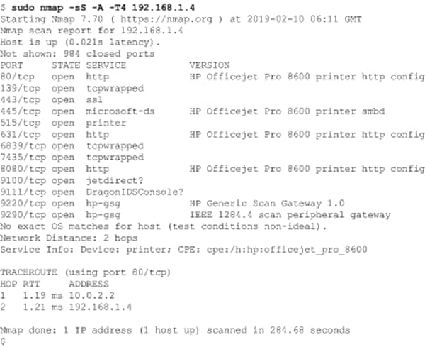 Figure 2 provides the sample output of the Network Mapper (NMAP) port scanner utility. This particular request uses the stealth SYN packet method and requests service information for open ports against the network device 192.168.1.4. As shown in the output, NMAP identifies a large number of open ports and even identifies the device through information exchanged by the ports.