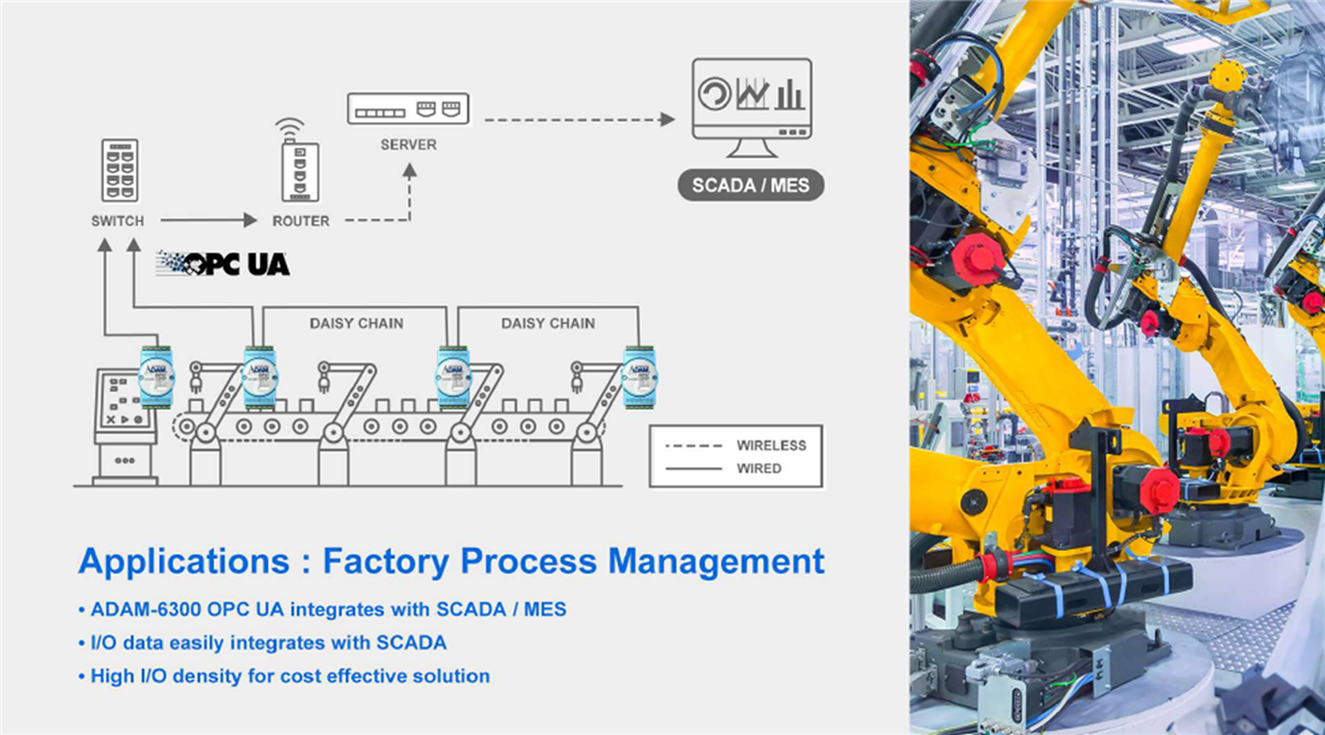 The Advantech ADAM-6300 Ethernet I/O Modules offer support for both OPC UA and Modbus. OPC UA, short for Open Platform Communications Unified Architecture, is an open standard that enables interoperable and cross-vendor collaboration of machines in production and makes communication between machines and systems possible. I/O data can either be processed through Modbus to legacy OT systems or be integrated into SCADA via the cloud and OPC UA.