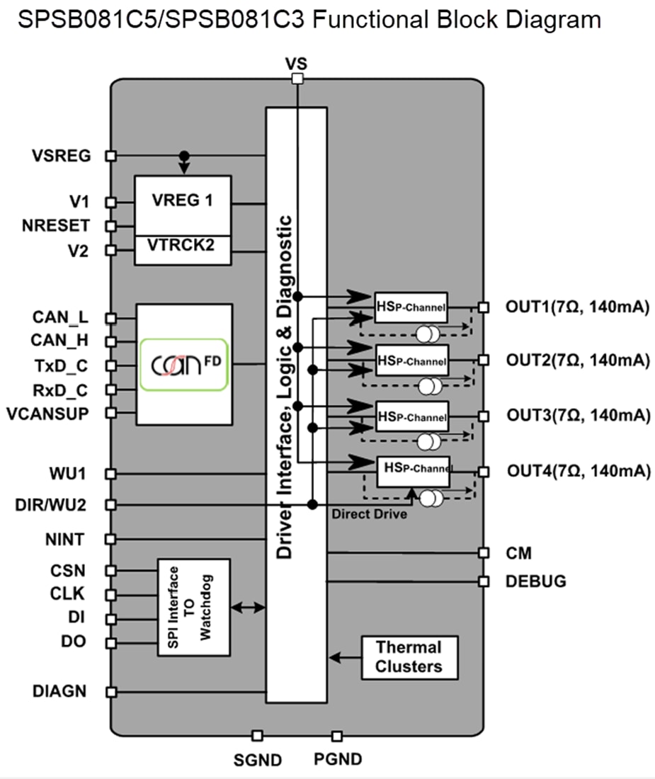 - CAN-FD transceiver (ISO 11898-2/2016, SAE J2284 compliant) with local failure and bus failure diagnosis